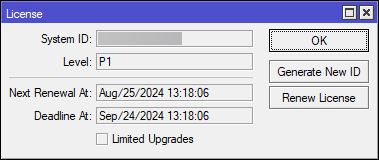 通过winbox登录RouterOS在System - License - Renew License 输入你注册的id(e-mail)和密码,就可以进行试用了,直接上PU或者P1授权都可以
