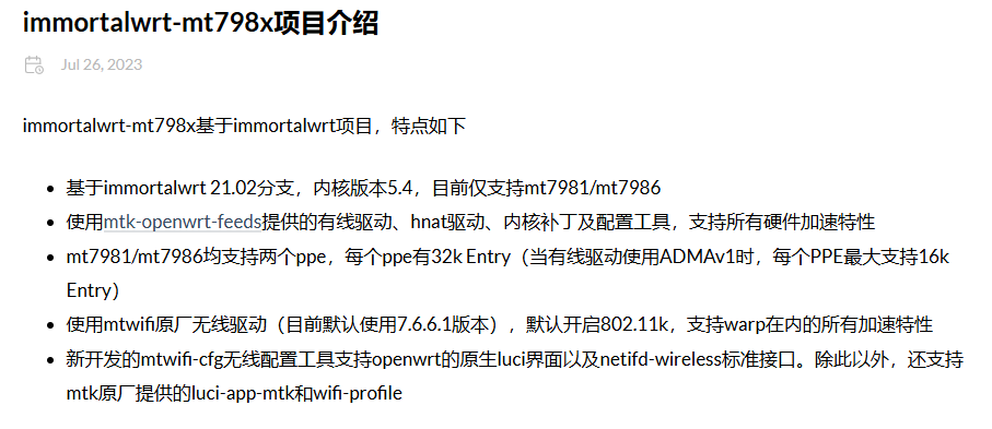 immortalwrt-mt798x基于immortalwrt 21.02分支,内核版本5.4,目前仅支持mt7981/mt7986,使用mtk-openwrt-feeds提供的有线驱动、hnat驱动、内核补丁及配置工具,支持所有硬件加速特性,是追求服务稳定运行的不错选择。